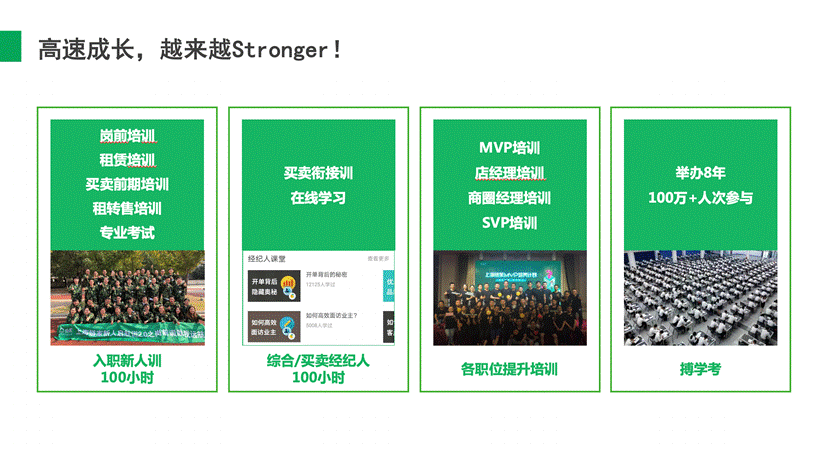 链家拥有链家专有培训基地,链家学院,5800多培训讲师。新人训—在职经纪人能力提升衔接培训—新任店经理培训—店经理管理培训等,一整套完善的培训机制。一系列人才的标准化培养:经纪人的一天、店经理十六步、带看九要素、奇妙等式等,科学的的培训和辅导让你在最短时间锻炼提高、成长为一名自信成熟的年轻人。