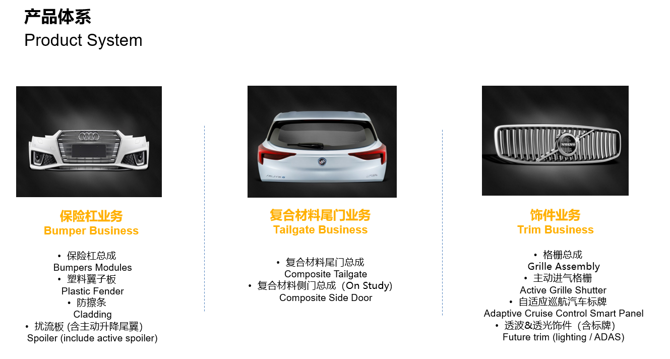 公司自主设计、开发、制造和销售汽车保险杠、保险杠总成模块、门槛、翼子板及塑料尾门等汽车外饰零部件。