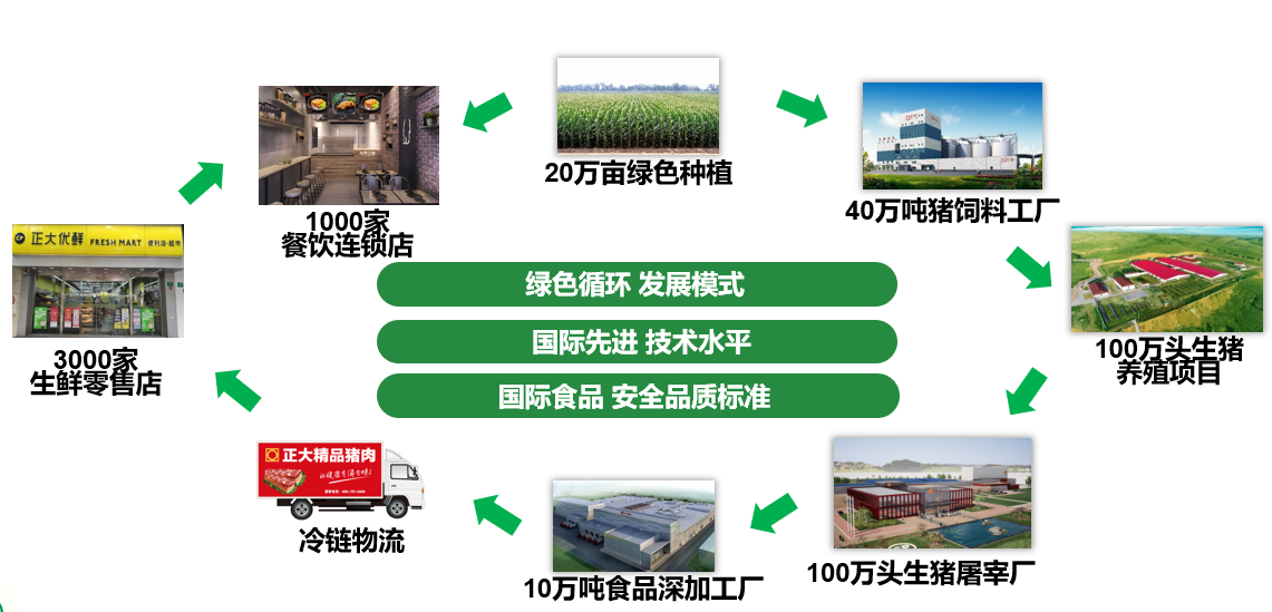 公司将以“1+N”模式在内蒙古地区布局3000家正大生鲜食品专卖店和1000家餐饮连锁店并配套冷链物流项目,打通农场到消费者餐桌的最后一公里,把集团和公司自产的安全、健康、营养、绿色、可追溯的食品带入千家万户,维护消费者舌尖上的安全。主要业态有:正大生鲜便利店、正大生鲜食品直营中心、正大精品猪肉店、社区冰箱等。