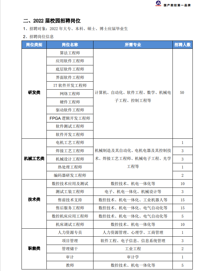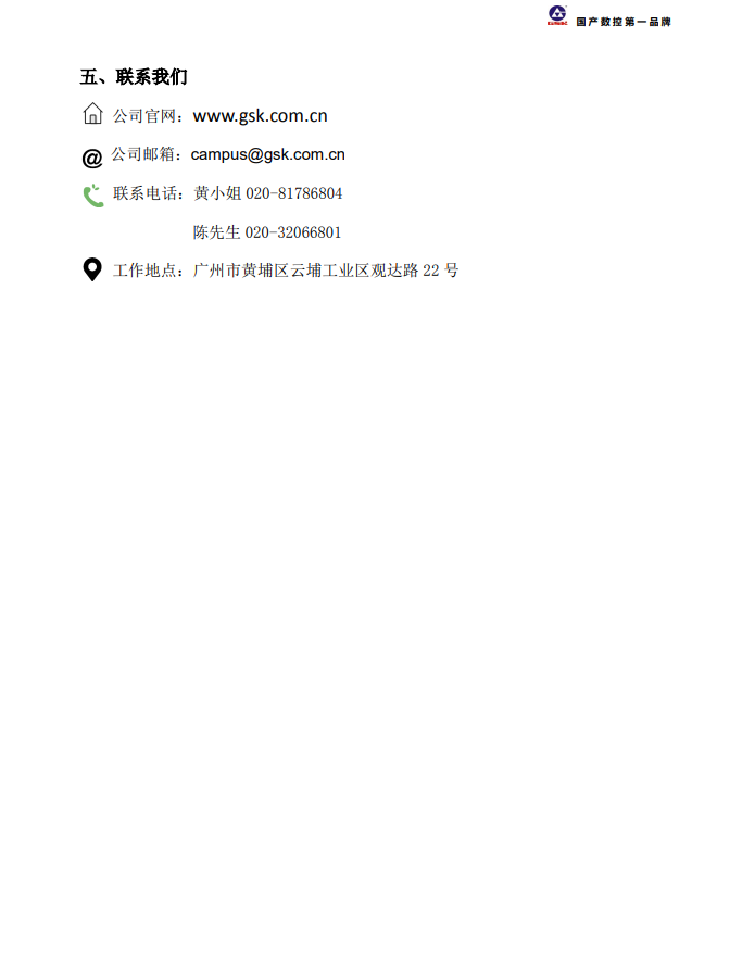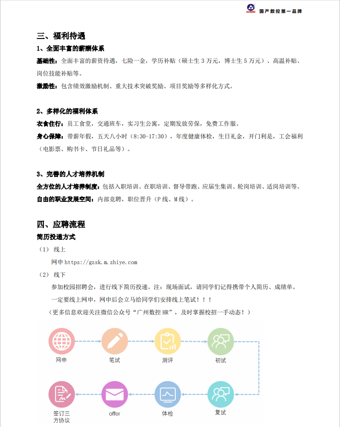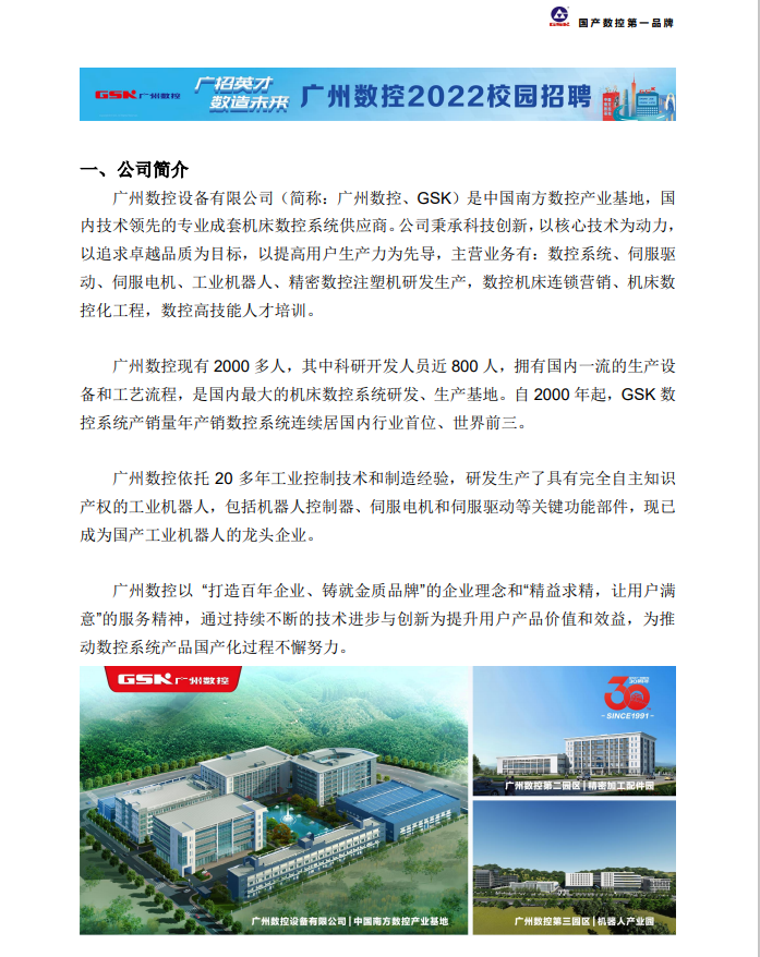 广州数控设备有限公司成立于1991年,二十多年来专注于机床数控系统、伺服驱动装置与伺服电机的研发及产业化,并积极拓展工业机器人与精密电动注塑机两大业务领域,已发展成为国内最具规模、技术最完整的数控系统研发与生产基地,是我国数控行业的龙头企业。 广州数控注重技术自主创新,是国家863计划、国家重大科技专项《可重构全数字高档数控装置研发及产业化》、《高性能全数字通用型驱动装置及交流伺服电机主轴电机的研制与产业化》承担企业,首批高新技术企业、国家规划布局内重点软件企业、广东省创新型企业,拥有省级企业技术中心、省级工程技术研究中心、博士后科研工作站。“GSK”系列产品已成为国产数控系统的第一品牌,产品远销巴西、阿根廷、新加坡、马来西亚等二十多个国家和地区,连续11年产销量占国内市场的首位,并跻身世界前三。工作时间:五天八小时工作制,8:30-17:30,中午一个小时午餐休息时间;保险:七险一金,签署正规劳动合同,提供完善的社会保险(养老;医疗;工伤;失业;生育保险;重大疾病;补充医疗)及住房公积金假期:公司员工依法享受法定假期:元旦、春节、清明、五一、端午、中秋、十一及带薪年假,食宿:公司设有卫生的职工食堂,川湘菜、粤菜口味任选;薪酬:同行业内优厚的薪酬标准,多种绩效激励机制培训:提供岗前培训和在职培训,广阔的职业发展空间活动:公司设有工会、科协等机构,有丰富多彩的业余活动其他:规范的工作条件,定期发放劳保、福利用品面试流程:简历筛选→初试→复试→资料审核、确定人选→入职体检→办理入职手续面试须知:面试需携带身份证、毕业证、学位证及其他技能资格证书原件和复印件1份,以及小一寸彩色相片1张。面试地址:广州市萝岗区云埔工业区观达路22号。乘车路线:广州各地铁站乘地铁转五号线到大沙东站D出口下车,直走100米左右到黄埔少年宫站转323路公交至观达路中站下车,下车后直走200米至广州数控即可。 面试预约电话:020-32066801, 江先生 面试邀请函发出邮箱:gzskzp@126.com gskhr@gsk.com.cn 面试程序:通过上述电话预约应聘者亲自至我司面试,并通过上述邮箱发送面试邀请邮件。公司对面试人员不进行任何地点的接站、接车安排。如应聘者无法辨别面试邀请信息真伪,可拨打上述面试预约电话进行确认。 请应聘者务必提高警惕,谨防上当受骗。公司官网:http://www.gsk.com.cn/